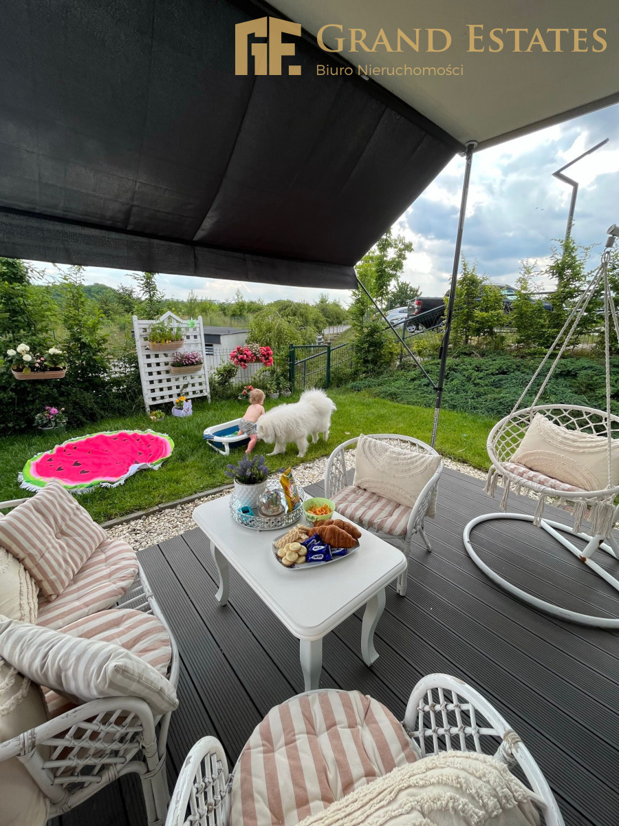 - Bezpośrednio z salonu wyjście na przestronny ogródek o powierzchni ok. 80 m², z widokiem na zieleń Parku Oruńskiego.
