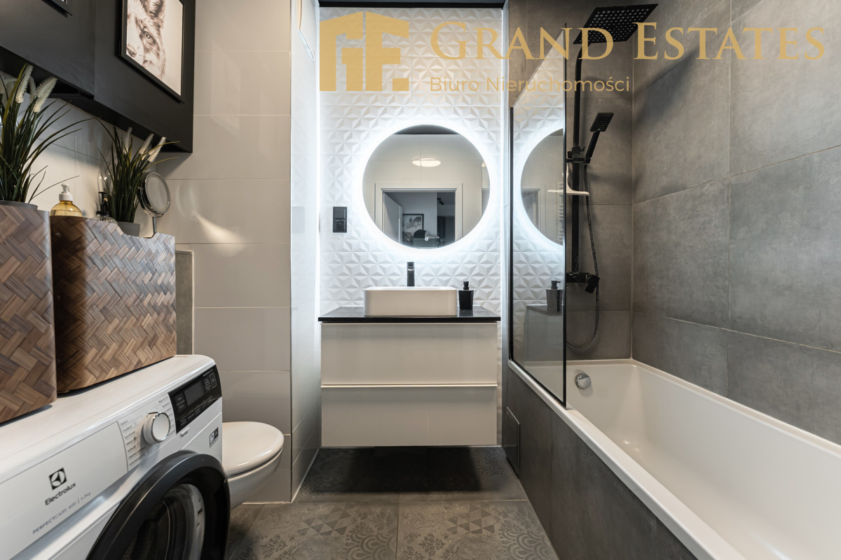 - Łazienka - elegancka, z wanną, nowoczesną armaturą i pralką.