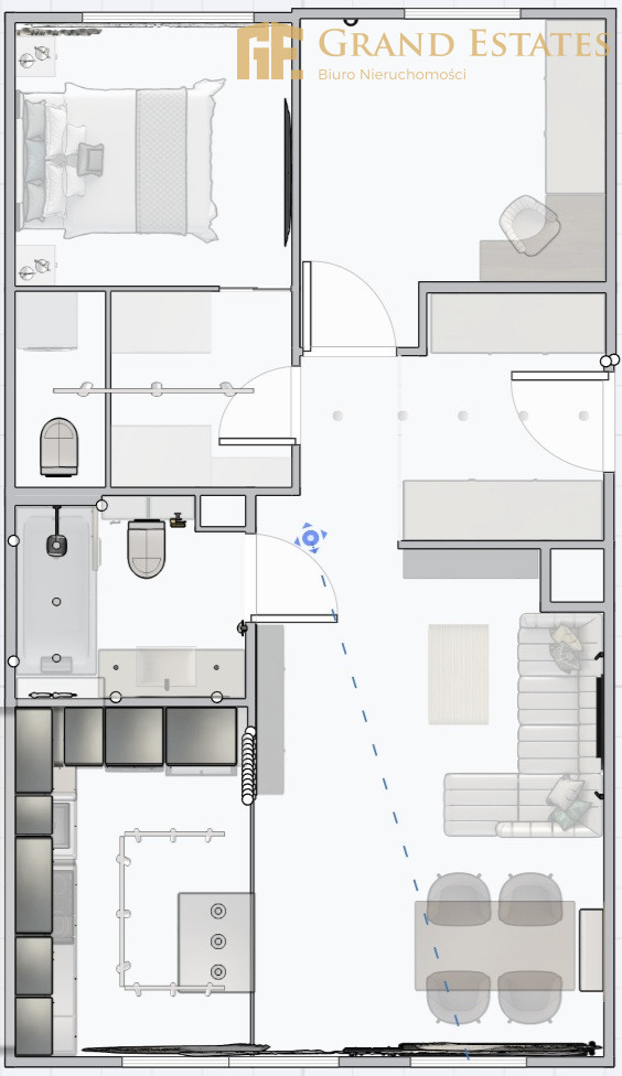 W skład mieszkania wchodzą:Salon z aneksem kuchennym - przestronny, jasny, z wydzieloną strefą jadalnianą oraz ukrytym biurem w zabudowie,