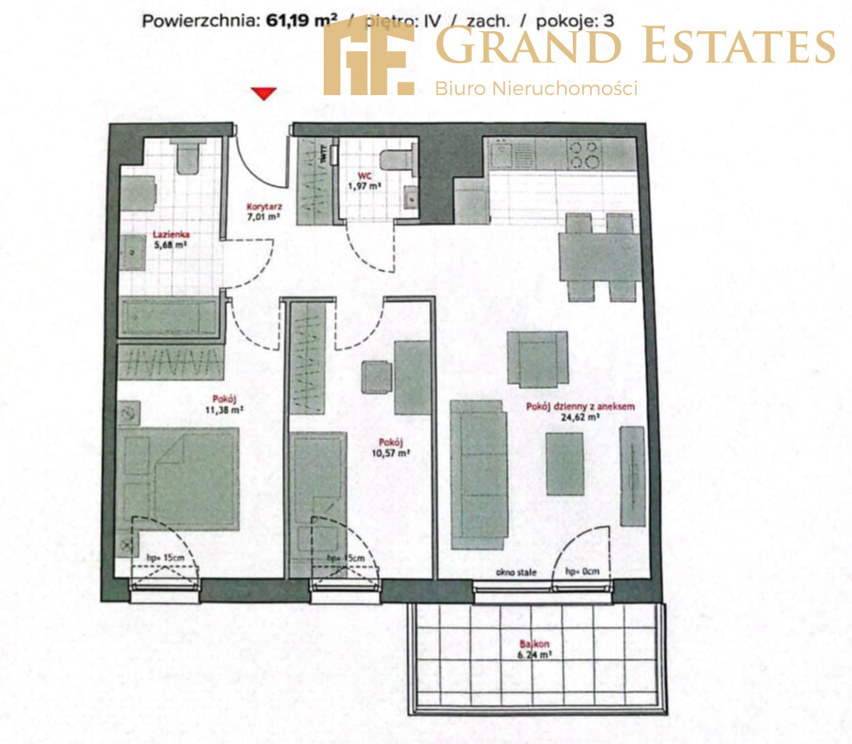 - Salon z aneksem kuchennym - 24,62 m², z wyjściem na balkon o powierzchni 6,24 m²