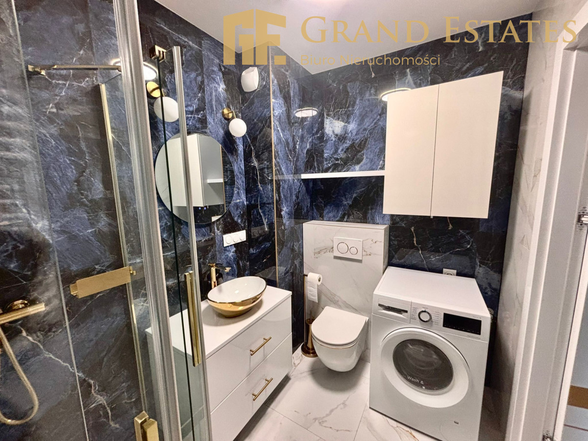 - łazienka-Nowoczesna, elegancka, z kabiną prysznicową, pralkosuszarką i praktyczną zabudową do przechowywania.